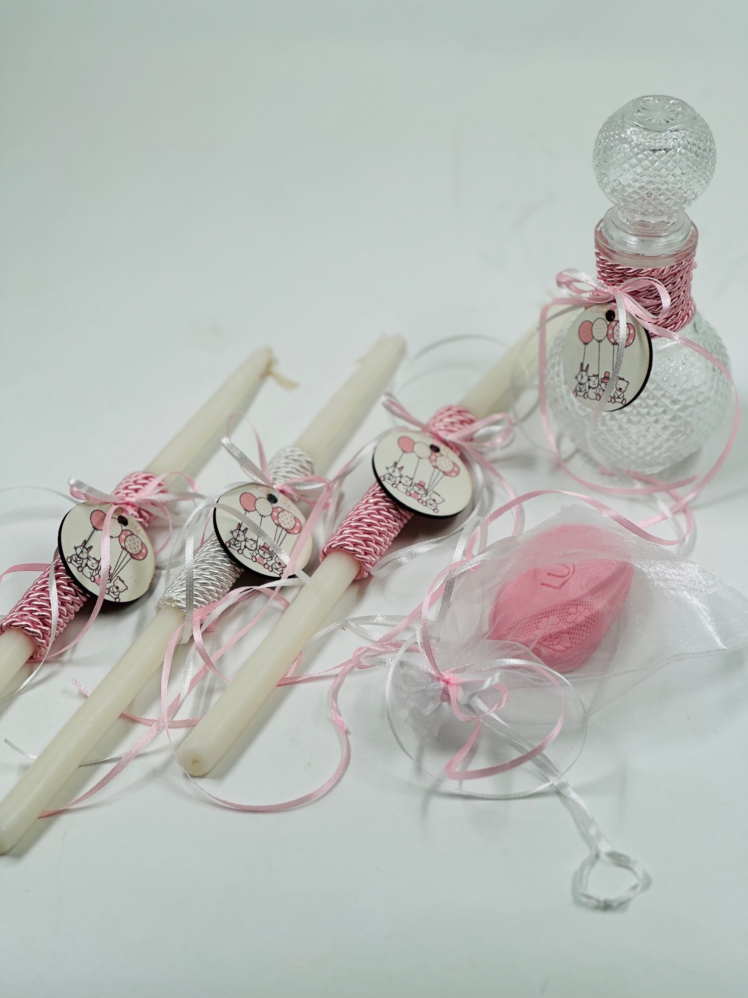 3 κεράκια, βαζάκι και ένα αρωματικό σαπούνι.
