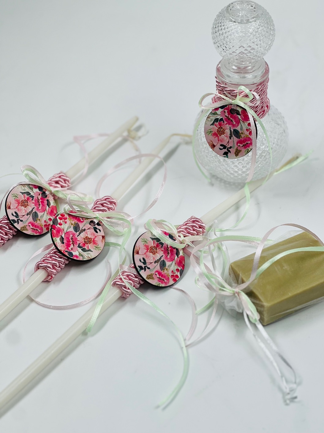 3 κεράκια, βαζάκι και ένα αρωματικό σαπούνι.