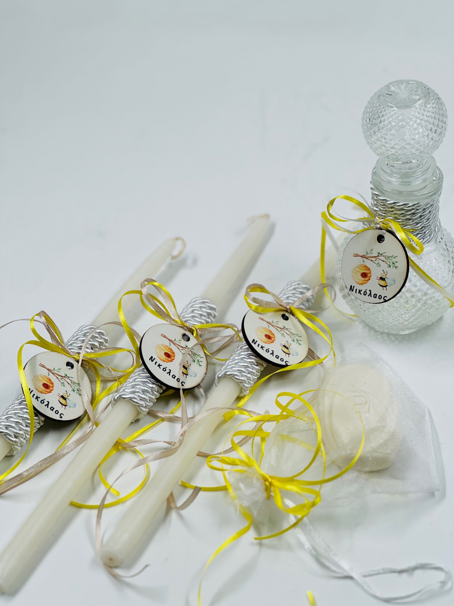 3 κεράκια, βαζάκι και ένα αρωματικό σαπούνι.