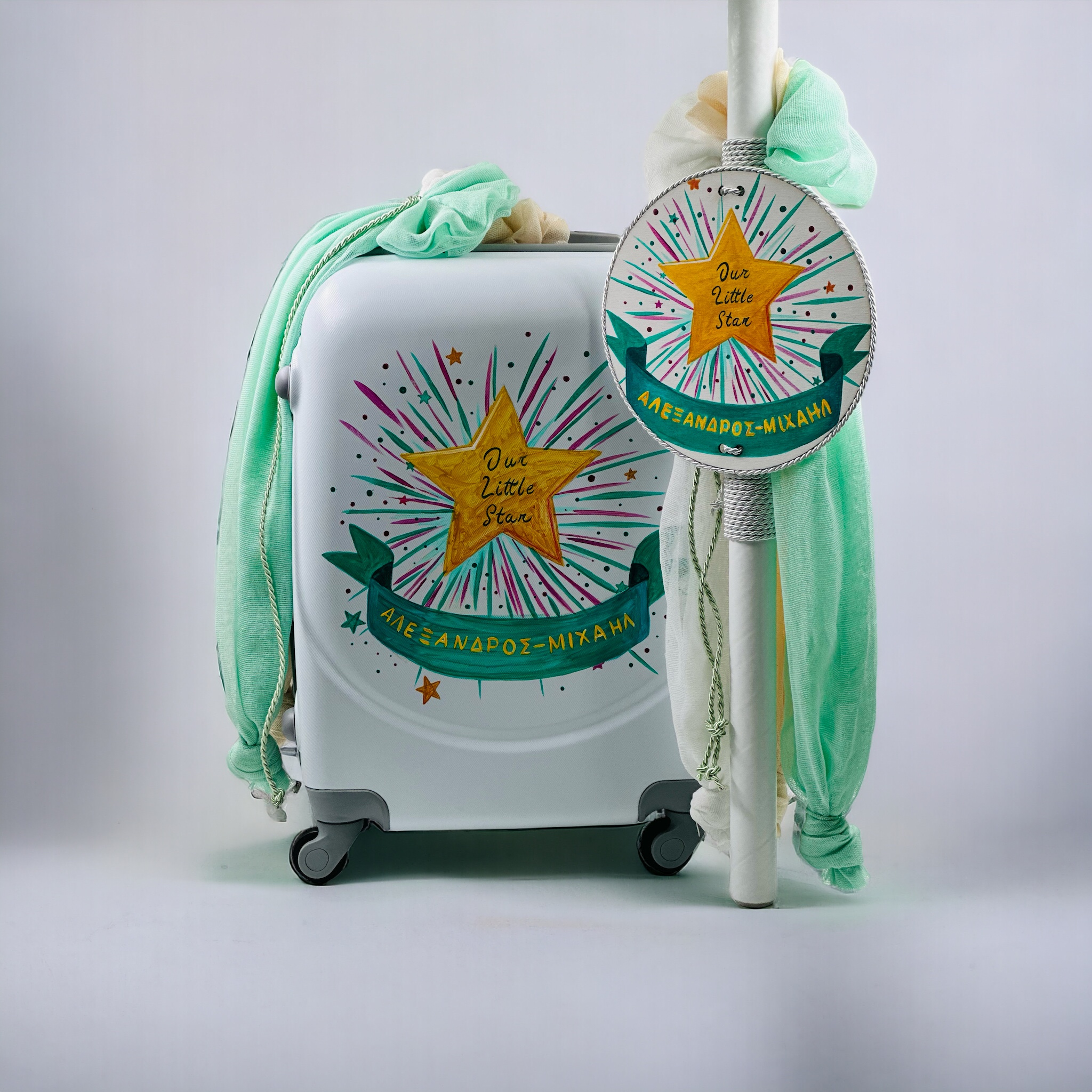 Ολικό Πακέτο Βάπτισης με Βαλίτσα, Βαλίτσα με Λαμπάδα Σάκο, Κουτί Απλό με Λαμπάδα Σάκο, Κουτί Απλό με Λαμπάδα Κορνίζα ή Περίγραμμα, Κουτί Καρότσι Κουτί με Λαμπάδα Σάκο, Παγκάκι με Λαμπάδα Σάκο, Κουτί Τροχήλατο με Λαμπάδα Σάκο, Επιδαπέδια Κρεμάστρα με Λαμπάδα Σάκο, Επιδαπέδια Βιβλιοθήκη με Λαμπάδα Σάκο, Σκηνή με Λαμπάδα Σάκο
