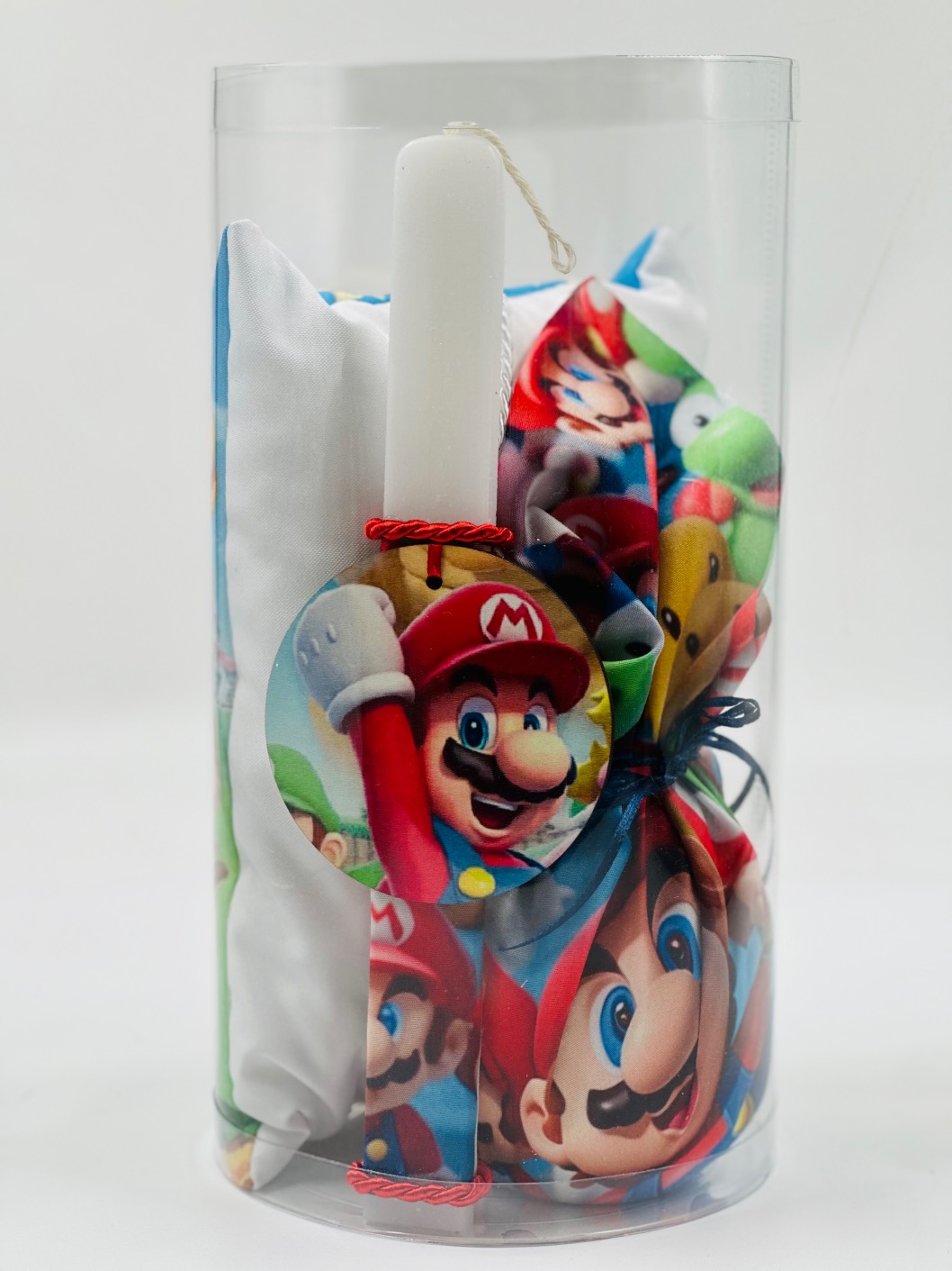 Λαμπάδα με Σουβέρ : Η κεντρική πρωταγωνίστρια του σετ μας είναι μια λαμπάδα, κατασκευασμένη με μεράκι και φροντίδα, με το θέμα τον “Super Mario”. Στη λαμπάδα συνοδεύεται ένα υπέροχο σουβέρ.