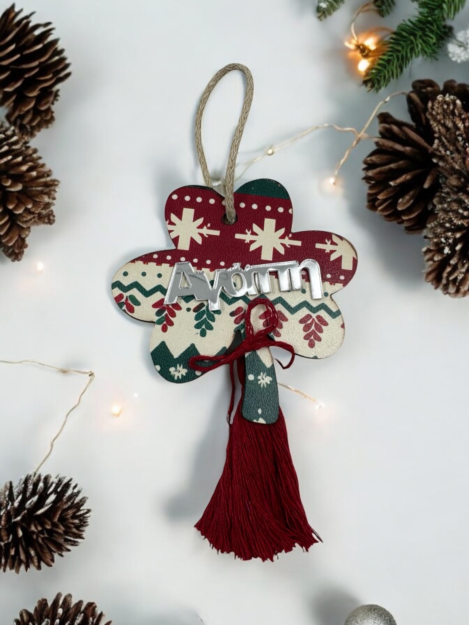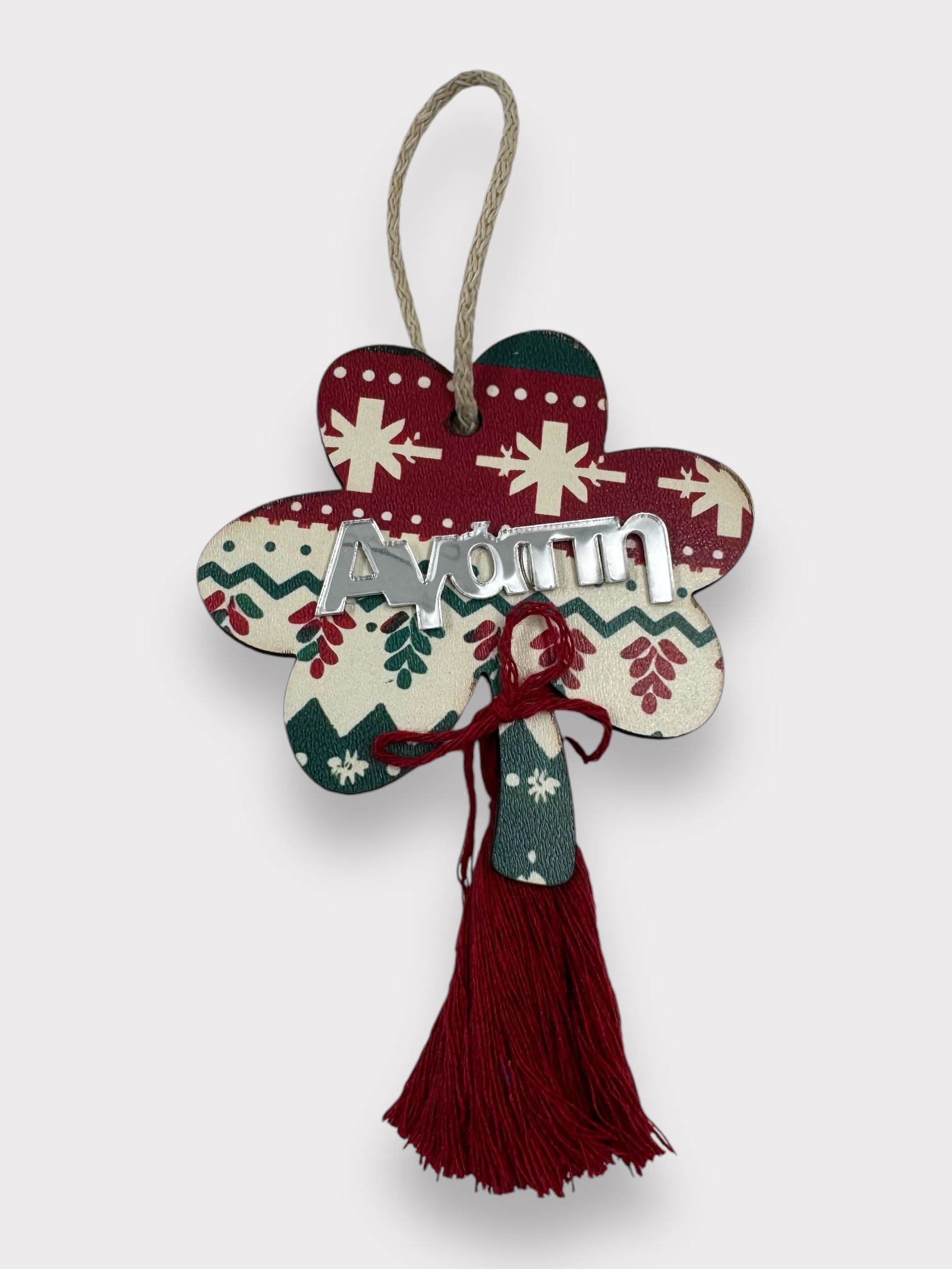 Τα χριστουγεννιάτικα στολίδια γούρια που προτείνουμε φέρουν τις παραδοσιακές συμβολικές μορφές του ροδιού, του ματιού, του σπιτιού, του τριφυλλιού και του δέντρου, ενώ κάθε ένα από αυτά είναι εμπλουτισμένο με λέξεις ευχών όπως “Ευτυχία”, “Χαρά”, “Αγάπη”, “Υγεία” και “Τύχη”. Αυτά τα στολίδια, φτιαγμένα από ξύλο και με διακοσμητικά στοιχεία από πλέξιγκλας καθρέφτη, αναδεικνύουν την κομψότητα και την παράδοση σε ένα εντυπωσιακό, μοντέρνο πλαίσιο, αντανακλώντας τις αξίες και τις προσδοκίες για τον νέο χρόνο.