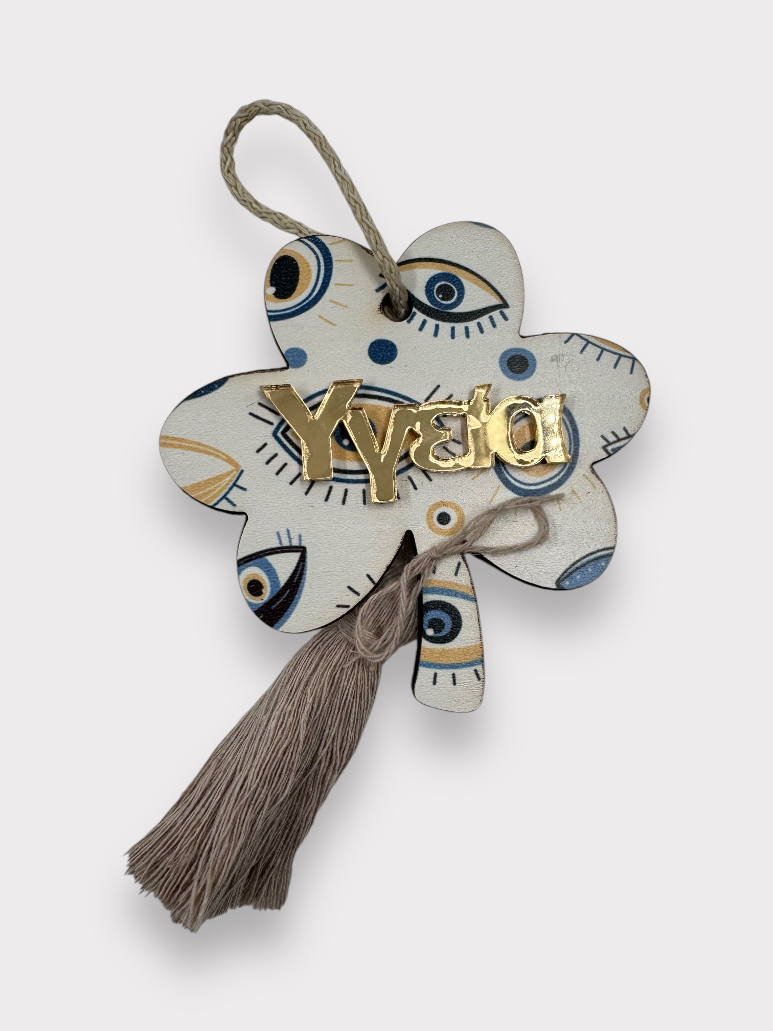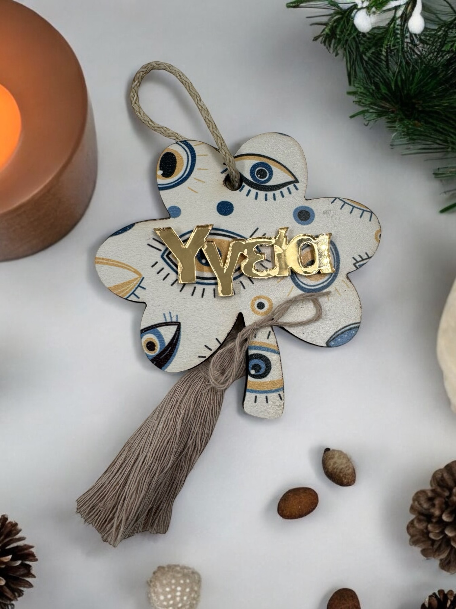Τα χριστουγεννιάτικα στολίδια γούρια που προτείνουμε φέρουν τις παραδοσιακές συμβολικές μορφές του ροδιού, του ματιού, του σπιτιού, του τριφυλλιού και του δέντρου, ενώ κάθε ένα από αυτά είναι εμπλουτισμένο με λέξεις ευχών όπως “Ευτυχία”, “Χαρά”, “Αγάπη”, “Υγεία” και “Τύχη”. Αυτά τα στολίδια, φτιαγμένα από ξύλο και με διακοσμητικά στοιχεία από πλέξιγκλας καθρέφτη, αναδεικνύουν την κομψότητα και την παράδοση σε ένα εντυπωσιακό, μοντέρνο πλαίσιο, αντανακλώντας τις αξίες και τις προσδοκίες για τον νέο χρόνο.